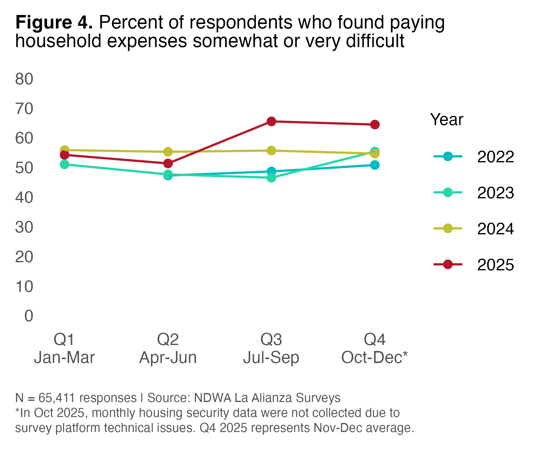 Finally, the share of respondents who found it somewhat or very difficult to pay regular household expenses in the last 7 days broke sharply with prior patterns in the second half of 2025—going from 54% in Q1 and 51% in Q2 to 65% in Q3 and 64% in November and December of Q4 (Figure 4). This represents the highest level of overall economic insecurity reported by respondents since NDWA began measuring it in March 2022.