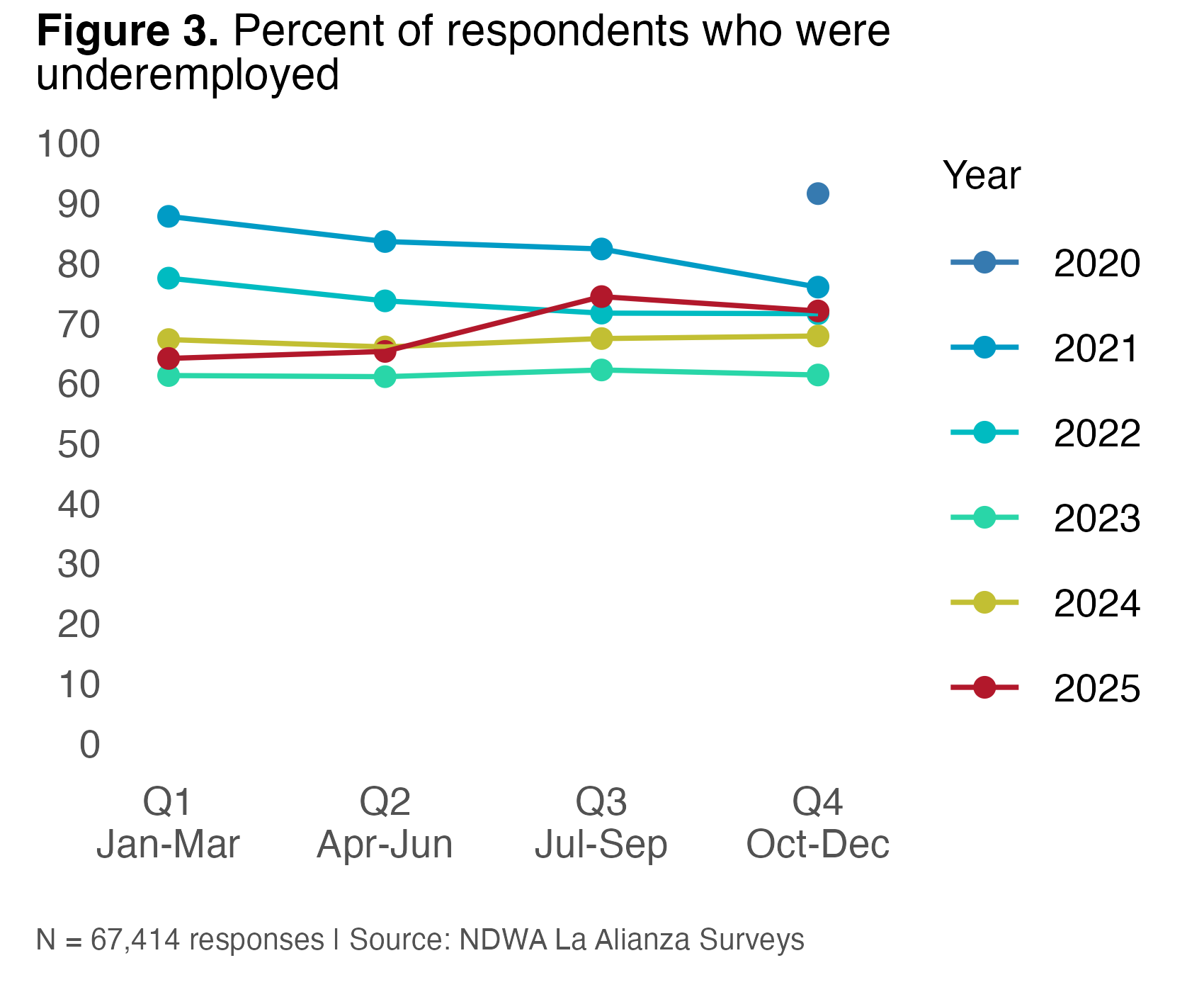 The percent of underemployed respondents was 64% in Q1, 65% in Q2, 74% in Q3, and 72% in Q4, also putting Q3-Q4 2025 underemployment on par with 2022 levels (Figure 3). The share of domestic workers earning $14 or less also ticked upwards in Q3 and persisted into Q4 2025 (Q1: 45%, Q2: 46%, Q3: 51%, Q4: 50%).
