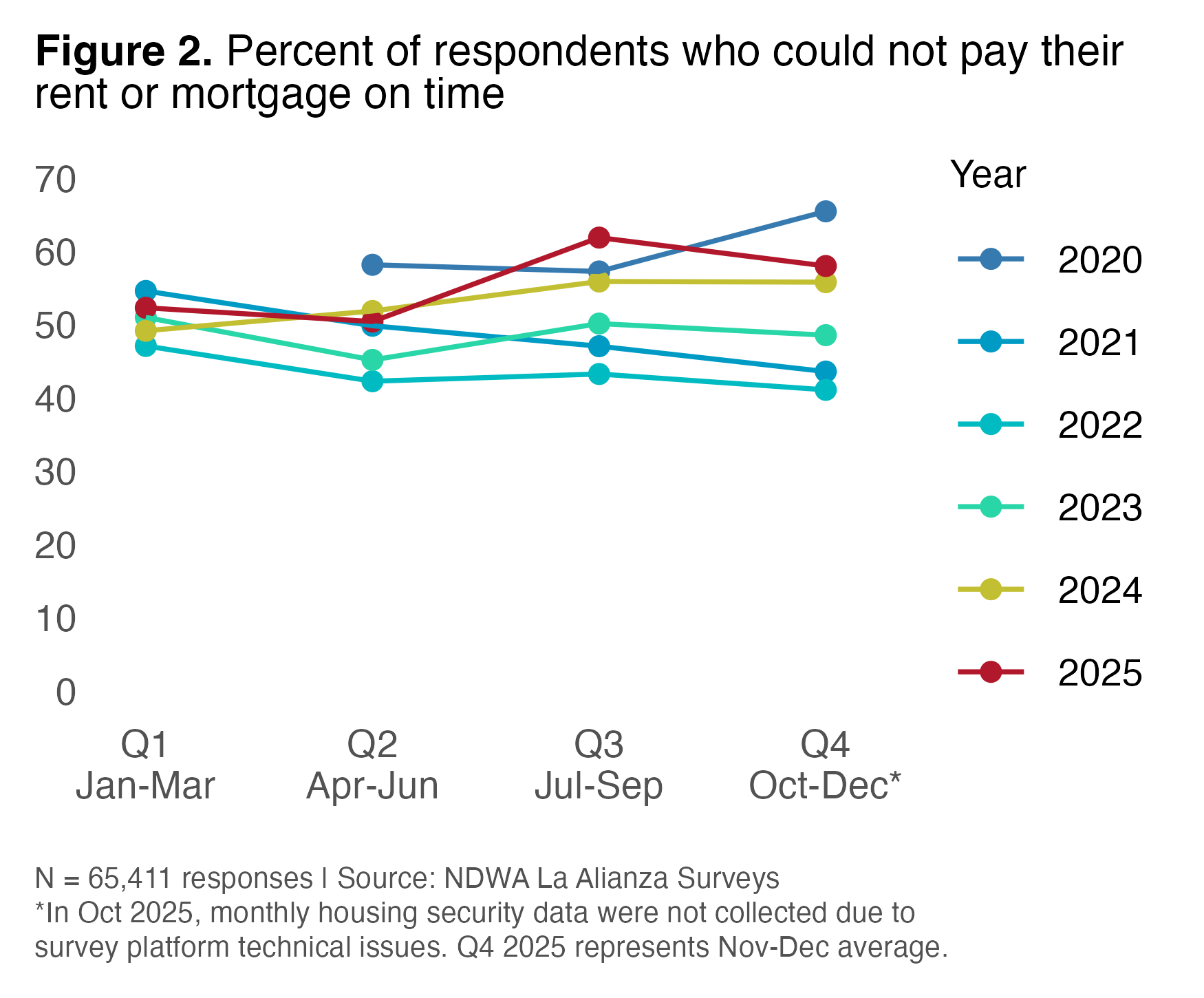A vulnerable economic situation deteriorated sharply in Q3 and persisted in Q4. Housing insecurity—which had already risen well above 2021 levels by the last half of 2024—rose again from 52% in Q1 2025 to an all-time high in Q3 2025, with 62% of respondents unable to pay their rent or mortgage on time in the last 30 days (Figure 2). Survey platform interruptions led to non-collection of monthly economic data in October 2025. Data from the rest of Q4 indicated 58% of respondents in November and December could not pay rent or mortgage on time.