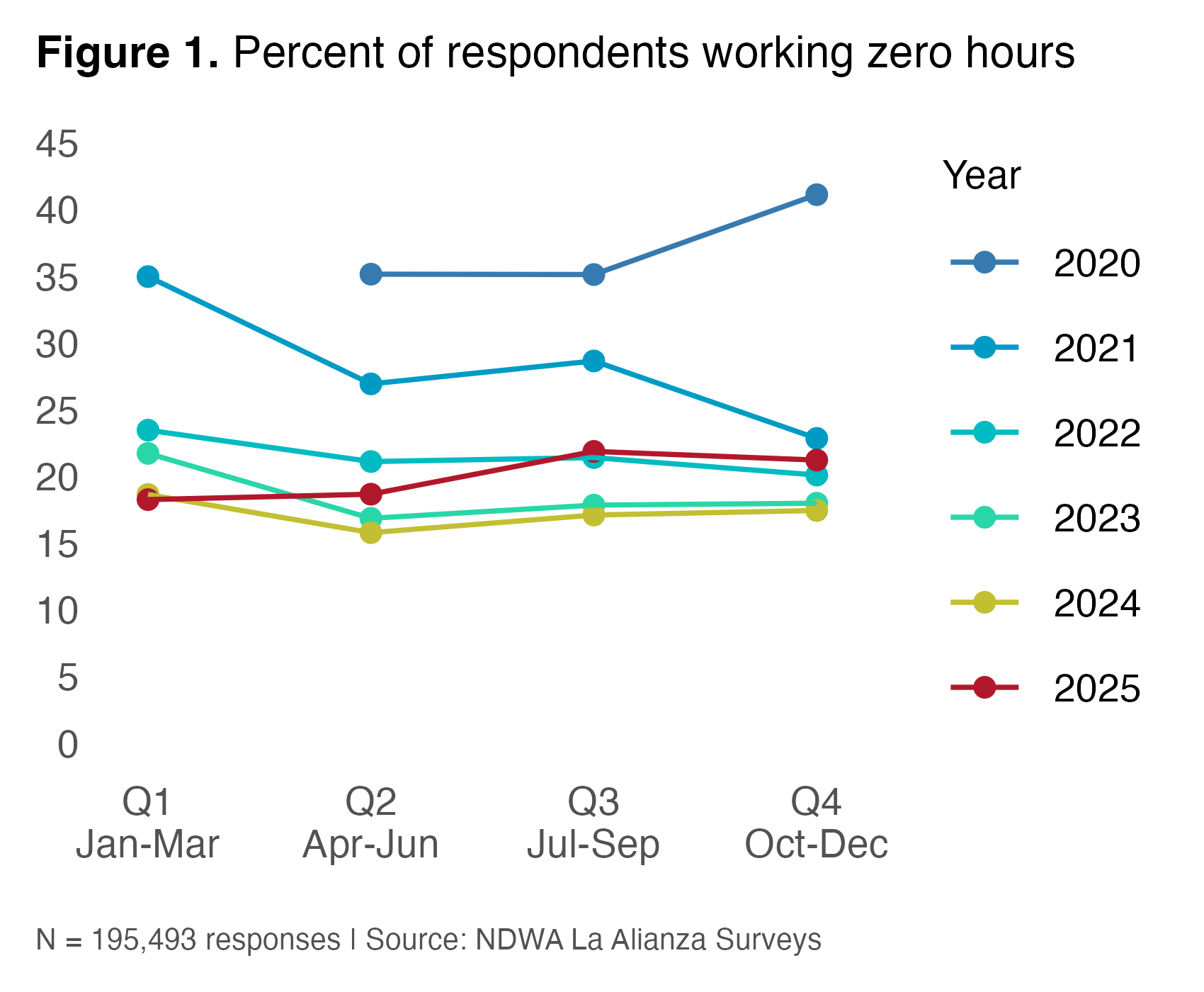 A tenuous recovery in employment conditions unravelled. After decreasing for years, the percent of respondents working zero hours rose from 18% in Q1, to 19% in Q2, 22% in Q3, and 21% in Q4 2025, putting Q3 and Q4 levels on par with those from 2022 (Figure 1).