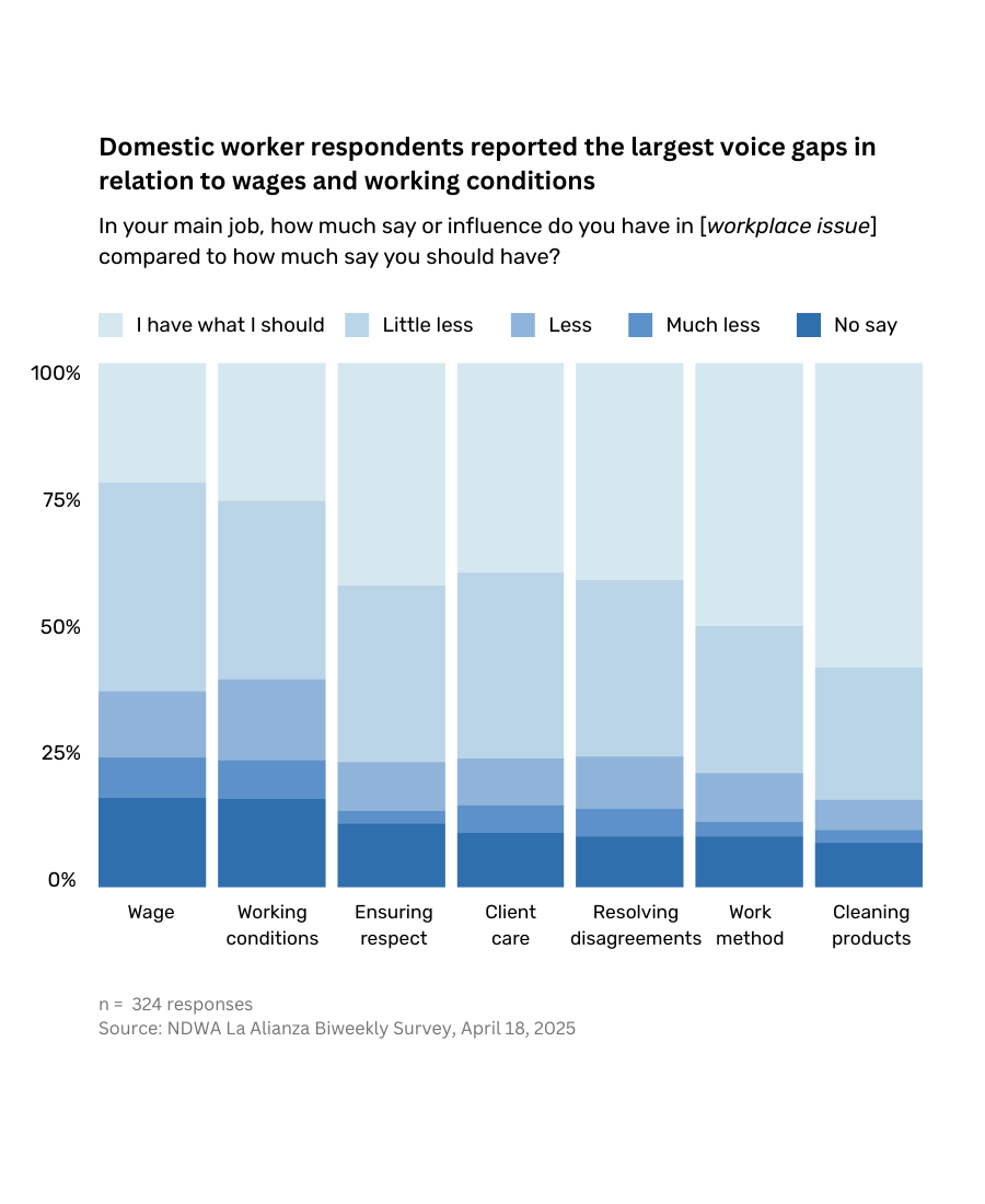 Surveyed domestic workers were asked about their voice at work regarding wages, working conditions, being treated with respect, resolving disagreements, and deciding how to perform their work. House cleaners were asked an additional question about voice when deciding which cleaning products to use, while nannies and homecare workers were asked about voice when deciding the care and activities their clients need.